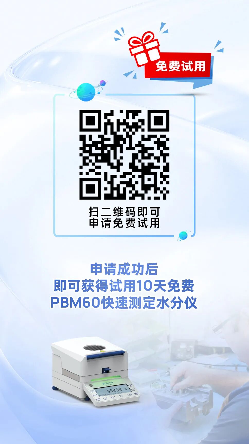 1、活动说明:活动期间,您只需提交试用申请、无需承担任何费用,即有机会获得PBM60快速水分测定仪10天免费试用体验。